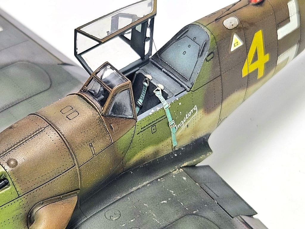 Trabajé con el kit Eduard 1/48. Los encastres son perfectos: una vez alineadas las piezas todo encaja sin sobresaltos. Añadí cinturones precortados que realzan el interior de la cabina y aportan un nivel de detalle que, en esta escala, se nota mucho.
