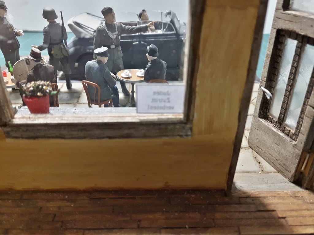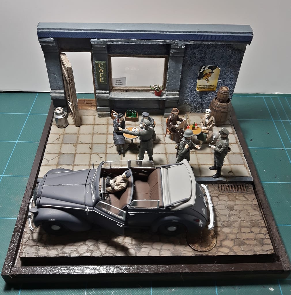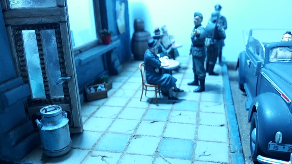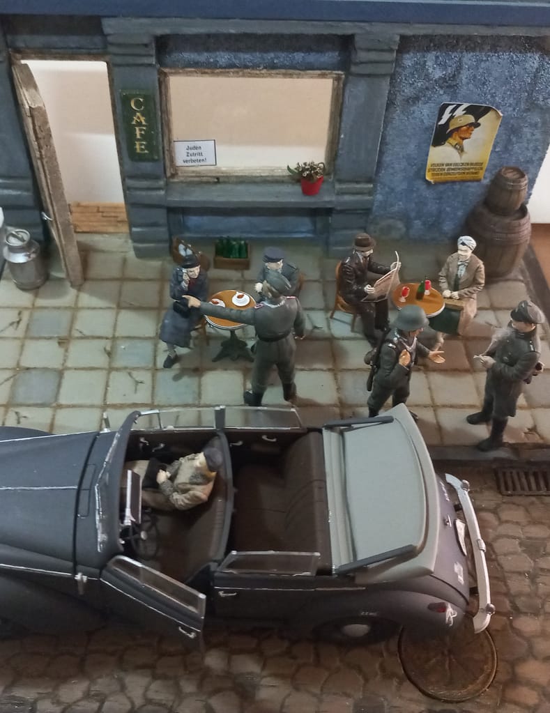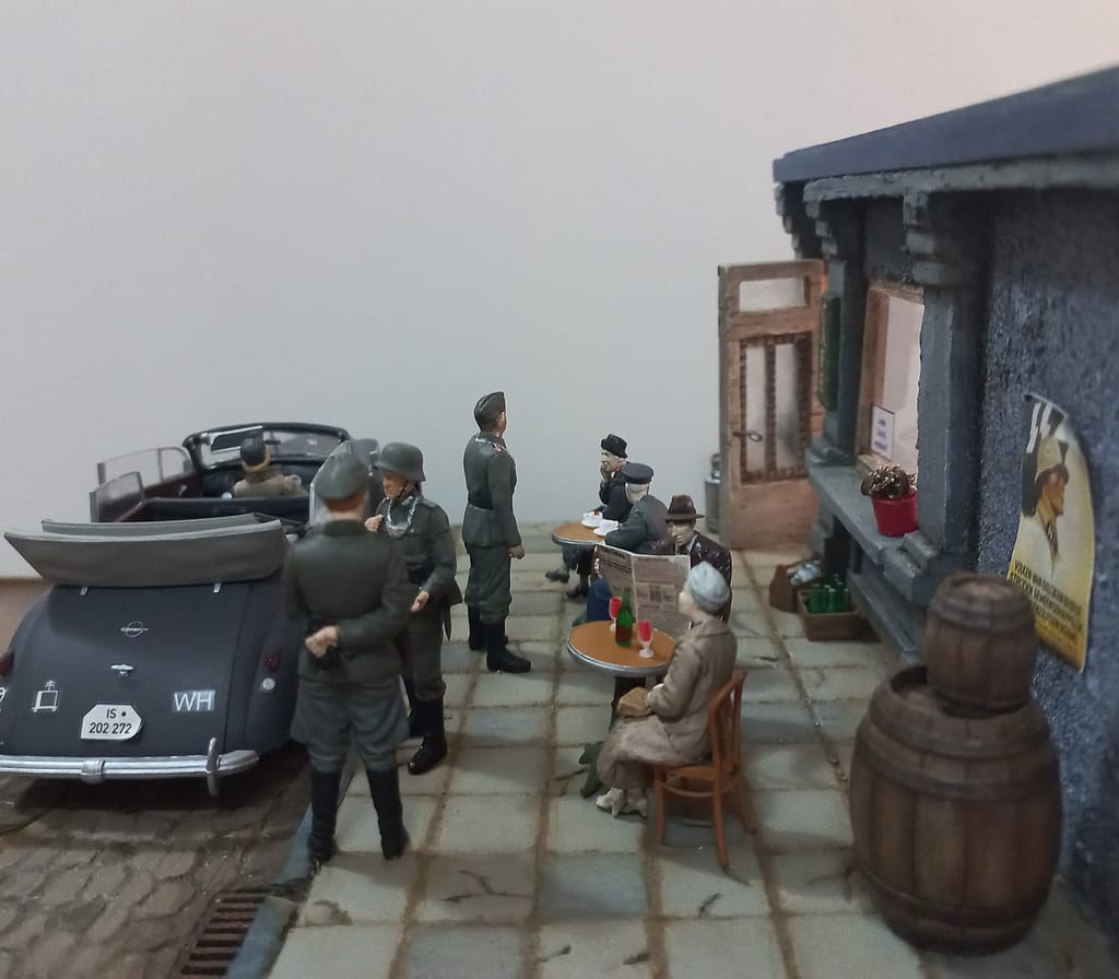 Este diorama en escala 1:35 busca capturar un instante cotidiano atravesado por la violencia silenciosa de la ocupación alemana durante la Segunda Guerra Mundial. La escena se desarrolla frente a un café que sugiere un entorno francés, donde la normalidad aparente —mesas, café al aire libre, transeúntes— convive con la arbitrariedad del poder militar. La intención no es recrear una batalla, sino mostrar cómo la opresión se filtra en los gestos más simples.