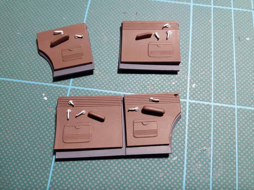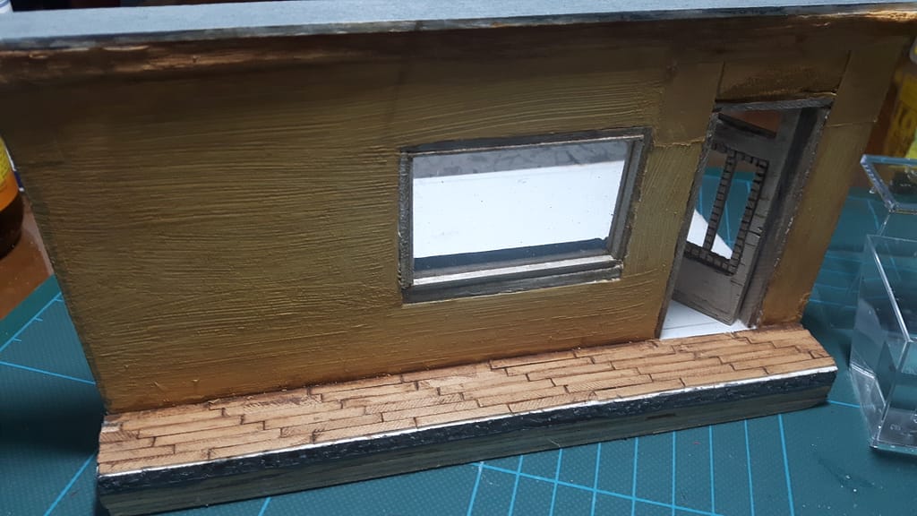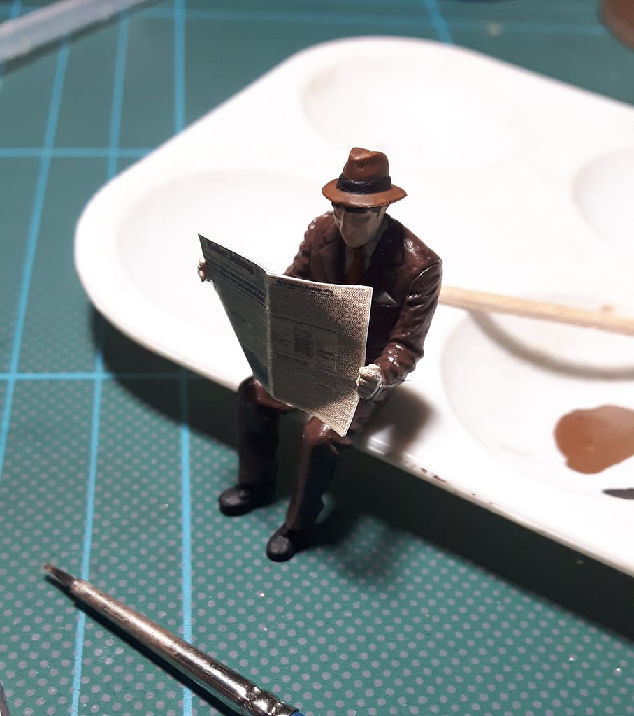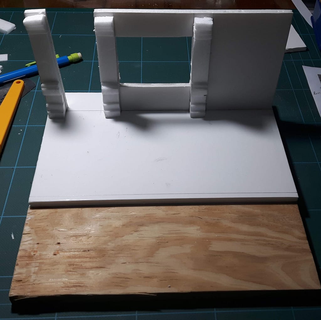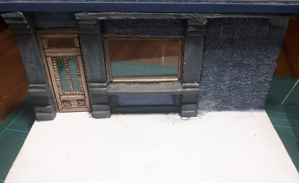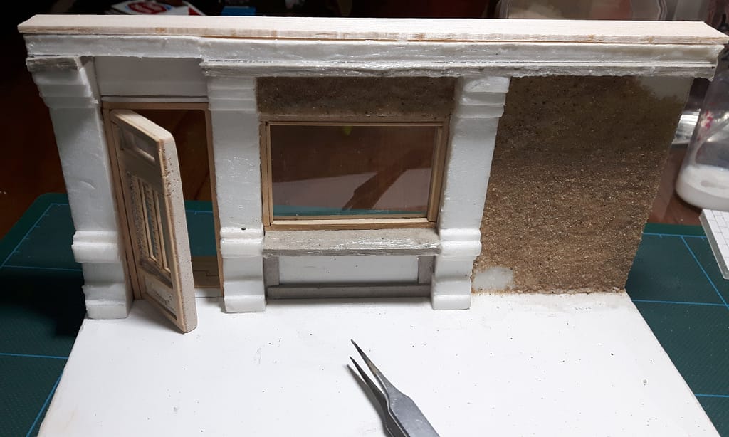 Accesorios y mobiliario urbano son de MiniArt, mientras que el edificio, la vereda y la calle fueron realizados de manera artesanal con telgopor, madera y enduído plástico. El objetivo fue lograr un entorno creíble sin sofisticación excesiva, priorizando la lectura clara de la escena. Las fotos del proceso muestran cómo materiales simples pueden transformarse en un escenario cargado de significado.