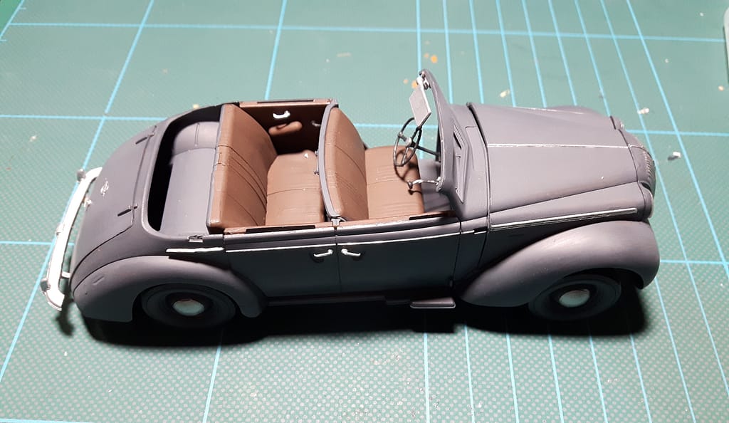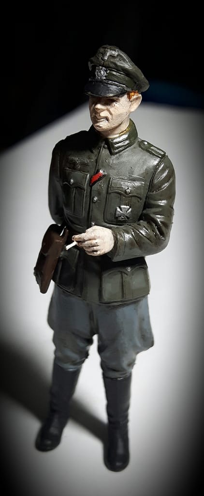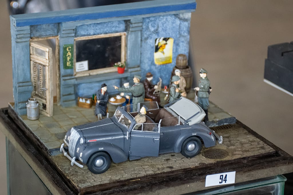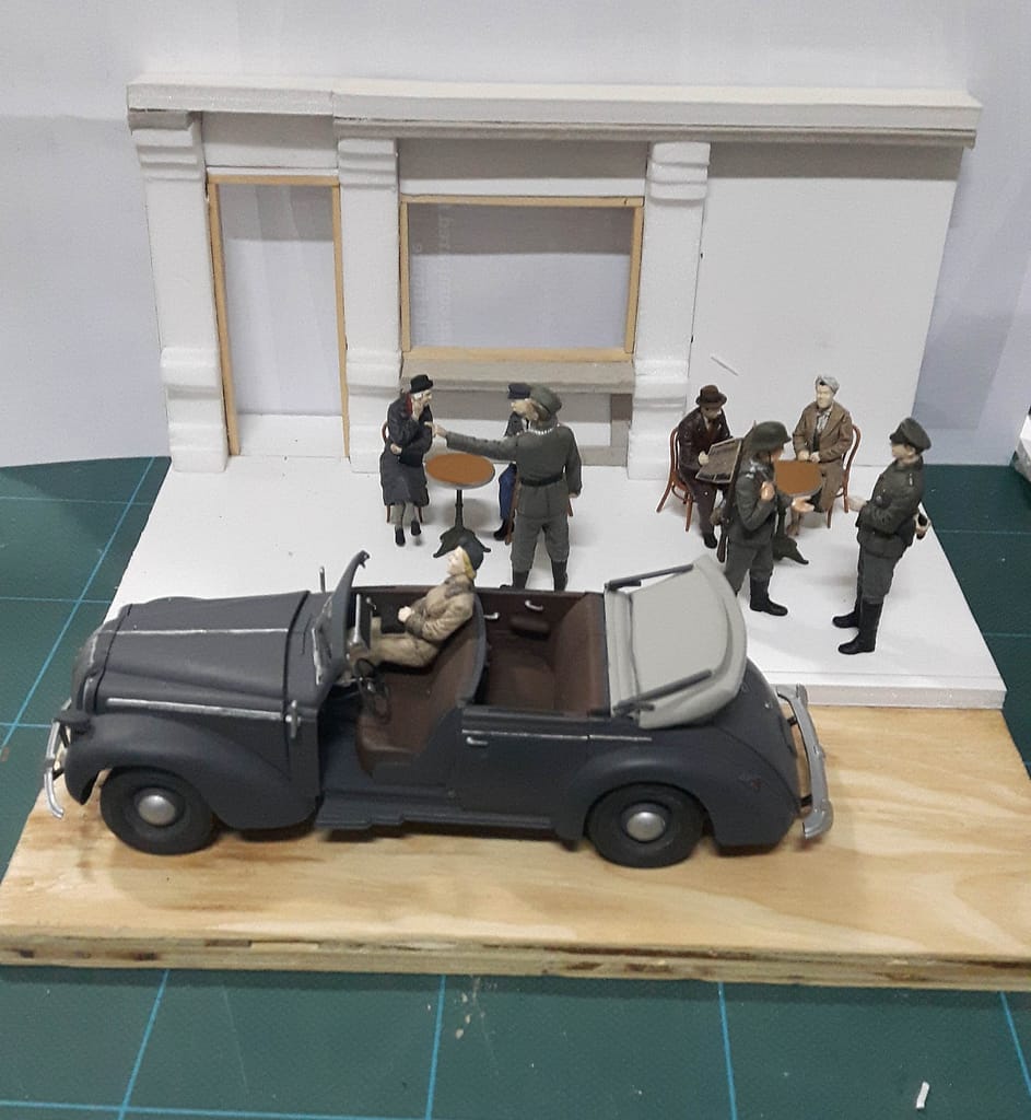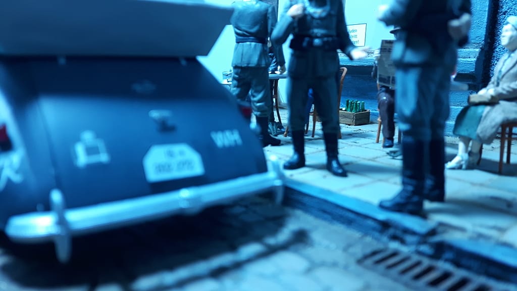 El vehículo es un German Staff Car “Admiral Cabriolet” de Revell, armado completamente “out of the box”. Su presencia —impecable, dominante— subraya la jerarquía del oficial alemán y contrasta con la vulnerabilidad de los civiles. La figura femenina en el asiento del acompañante refuerza la idea de privilegio dentro del contexto de ocupación. La puerta abierta indica que el oficial recién se ha bajado del vehículo.