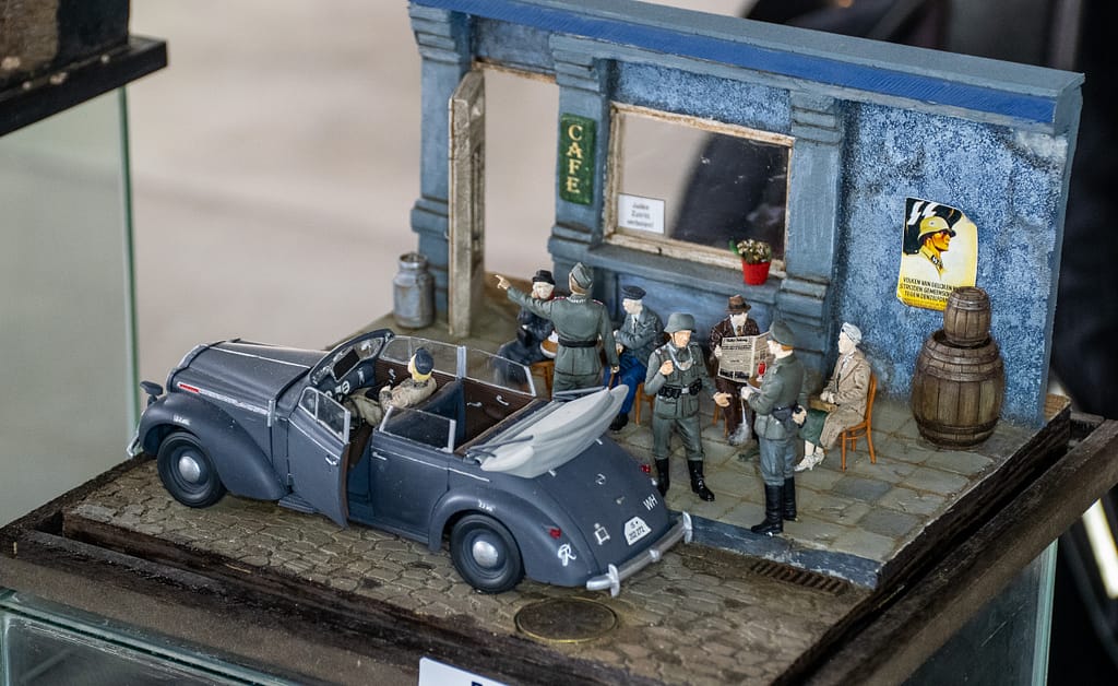 El cartel pegado en la vidriera del café refuerza el contexto histórico. Su inclusión no es decorativa: funciona como recordatorio explícito del sistema de exclusión y persecución que sustentó la ocupación. El diorama representa una situación histórica de opresión, no su glorificación.
