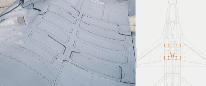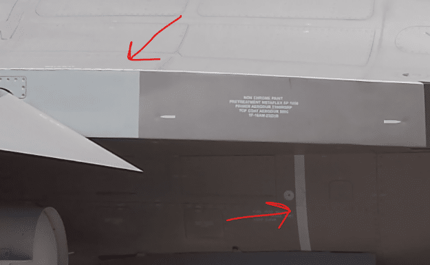 Por otro lado, también hemos encontrado que las versiones MLU ex danesas, para prolongar su vida útil fueron provistas de FRP – Fuselage Reinforcement Plates (Placas de Refuerzo estructural en Fuselaje); debido a que están colocadas en puntos clave donde la estructura del fuselaje sufre las mayores concentraciones de esfuerzos y fatigas estructurales debido a las fuerzas G´s. Están colocadas por fuera porque a la hora de hacer el mantenimiento masivo de tantos aviones, es mucho más simple colocar estas placas de titanio por fuera que desarmar la estructura y corregir dentro de las cuadernas y estructura interna en cada avión. Están colocadas según el siguiente diagrama:
