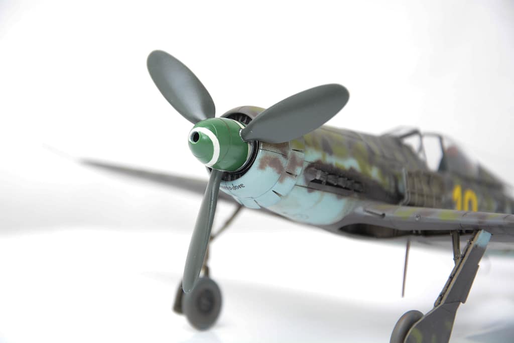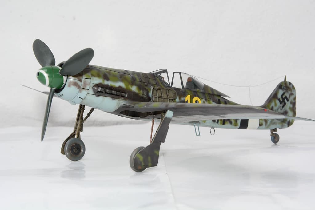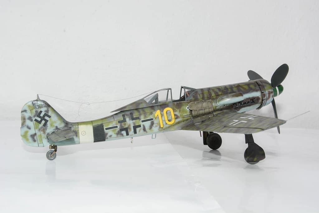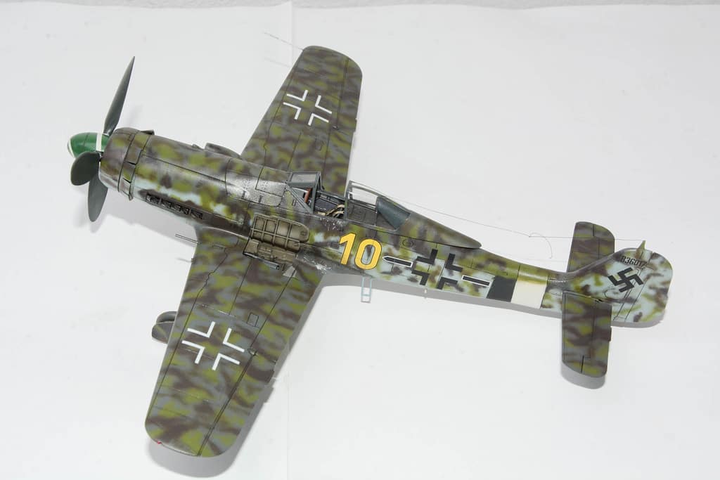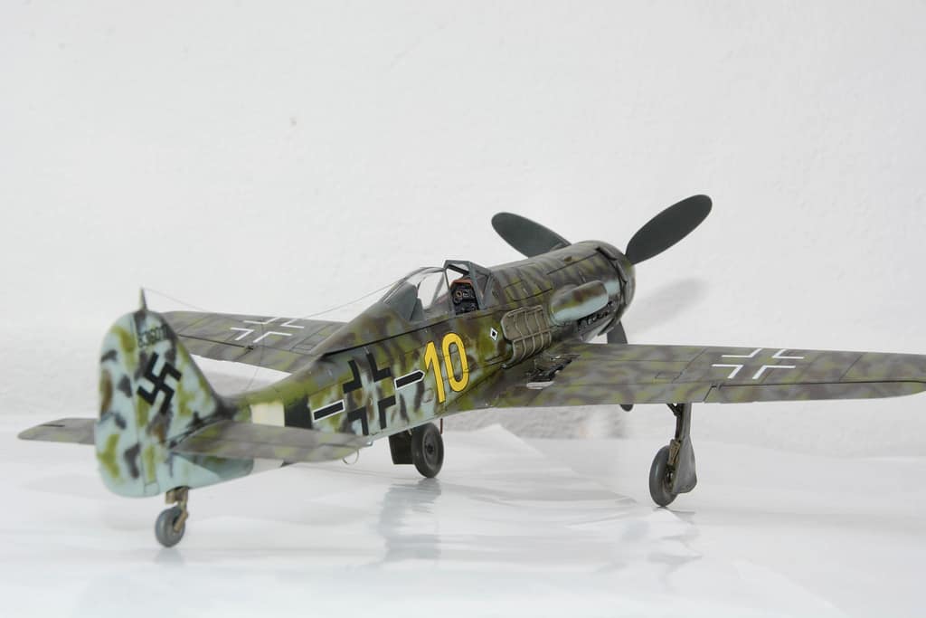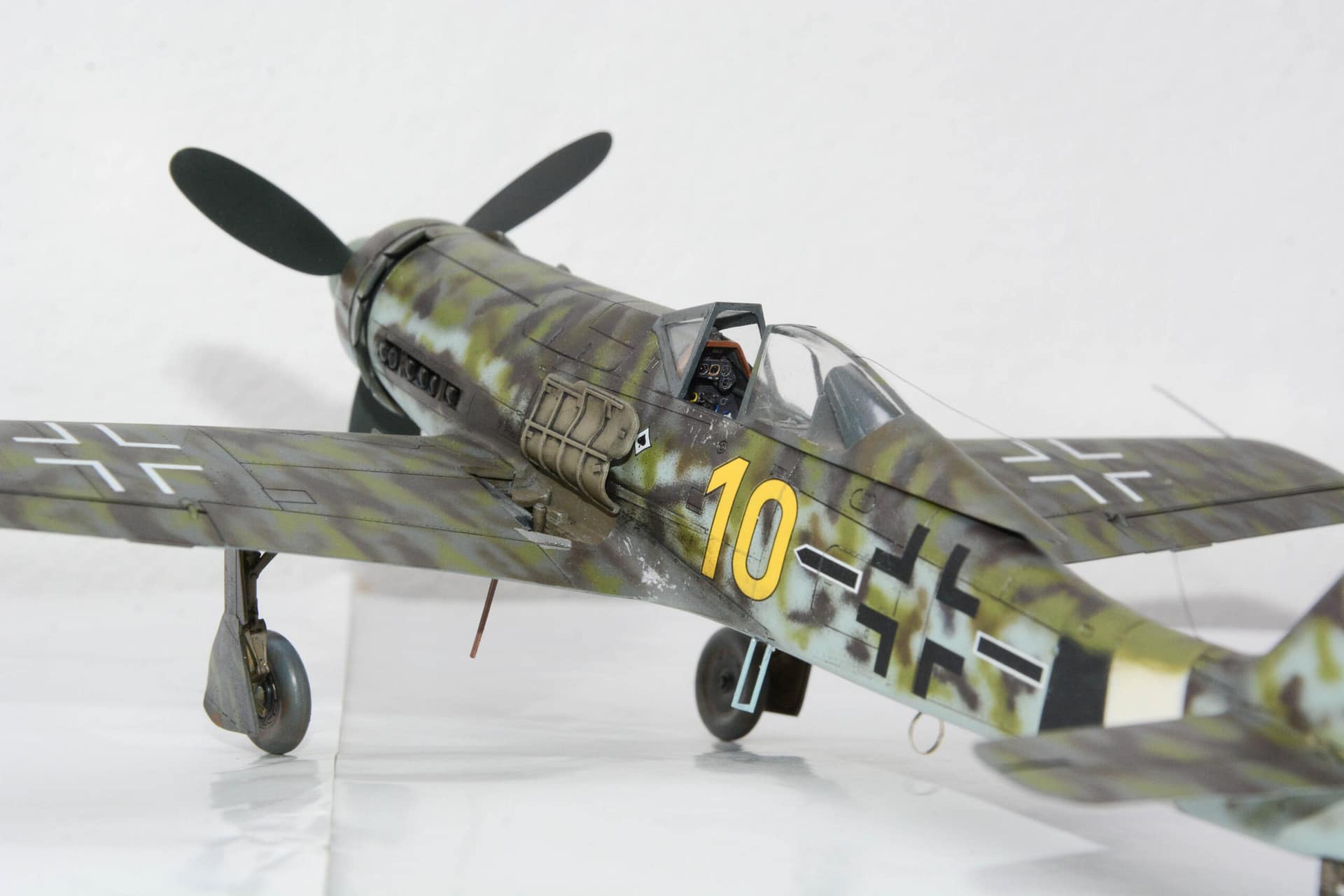 La elección del esquema es (al menos para mí) bastante lógica, empezando por el Amarillo 10, posee un patrón de moteado poco visto y muy desafiante a la hora de ejecutar a mano alzada, con superficies inferiores en distintos acabados, incluso en metal natural, y superposición de colores a lo largo de su corta vida operativa. Este aparato en especial (número de serie 836017) fue pilotado por el mayor Franz Goetz (63 victorias), el último comandante del JG-26, quien conservó el emblema Pik As (as de espadas) de su unidad anterior, la JG-53. Fue uno de los cinco fw190 de las series “D” de nariz larga, que se llevaron a Estados Unidos para su evaluación, siendo este el único de la versión D13 que sobrevivió a la guerra.