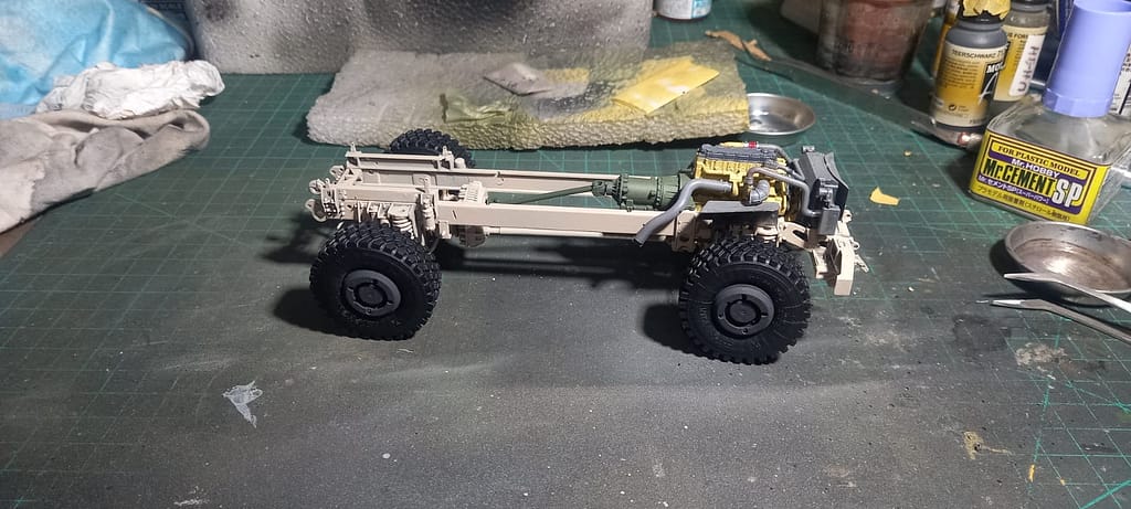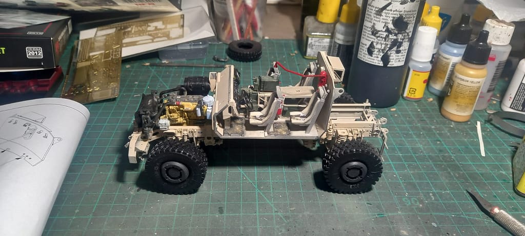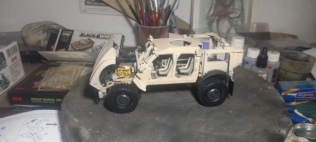El esquema elegido es el clásico color arena de vehículos desplegados en zonas desérticas. Se utilizó el tono “US Modern Vehicle” de AMMO Mig Jiménez (MIG025), aplicado mayormente con aerógrafo.