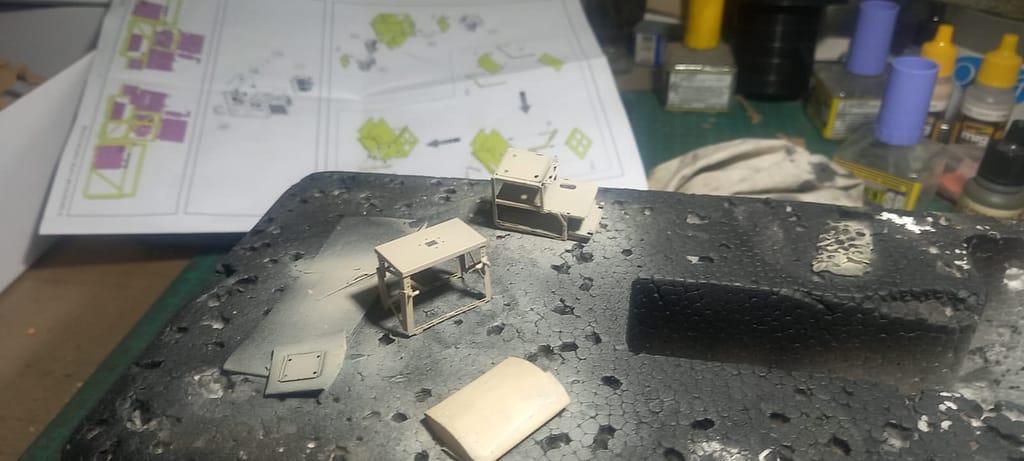 El kit de Ryefield Models en escala 1:35 se destaca por su calidad y nivel de detalle. “Son varios módulos que tenés que unir bien para que encajen perfecto”, explica HobbyMav. No fue necesario modificar el kit original, ya que la versión representada coincidía con la del fabricante. Se sumó un set de resina para la radio y su soporte, lo que aportó realismo adicional al interior.