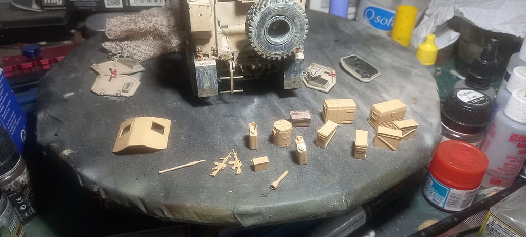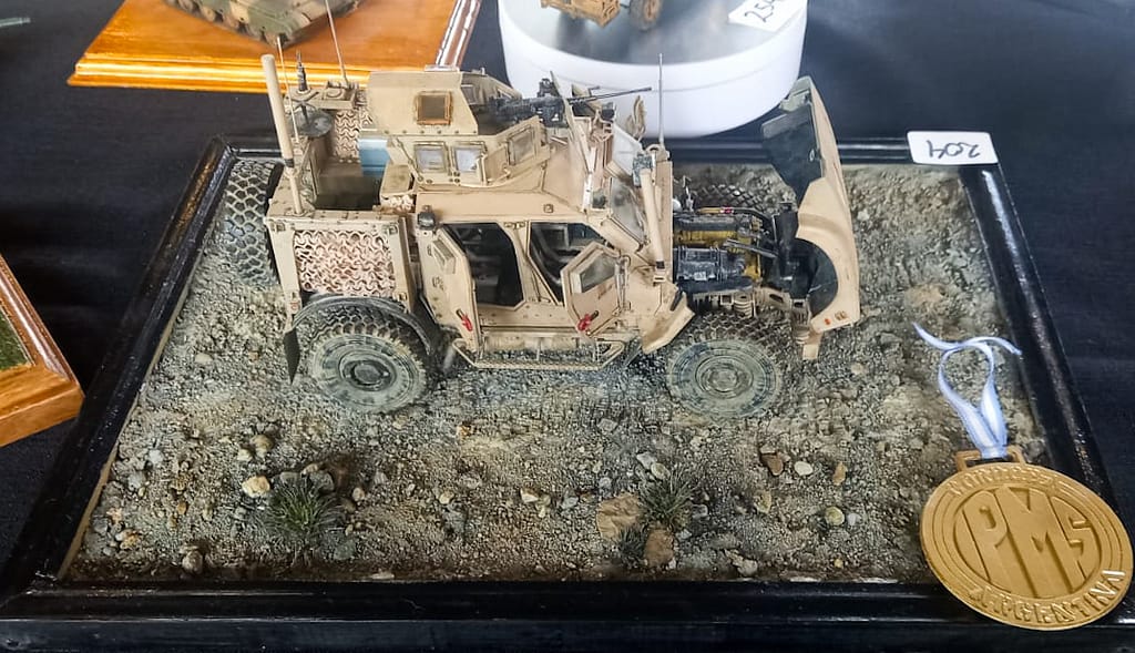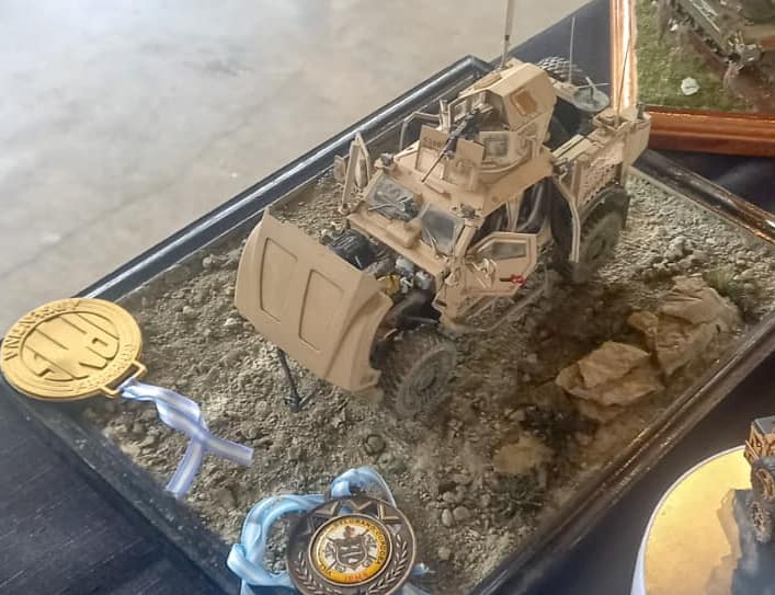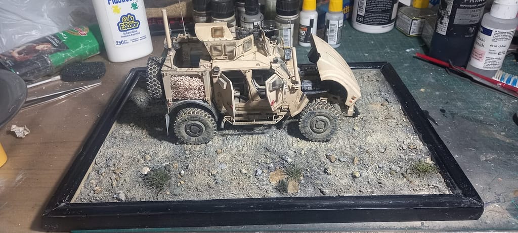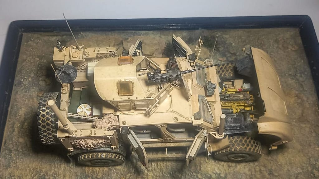 La maqueta se presenta sobre una base de yeso que simula el terreno afgano. El ensuciado de las ruedas en negro genera contraste y realismo. La red de enmascaramiento y los accesorios aportan dinamismo a la escena.