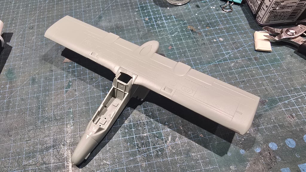 El ala la uní, repasé la línea de unión con lija fina y la presenté sobre el fuselaje para verificar la geometría general. Cuando vi que todo quedaba alineado —ala, pod central y botalones— recién ahí la pegué en puntos clave para evitar deformaciones.
