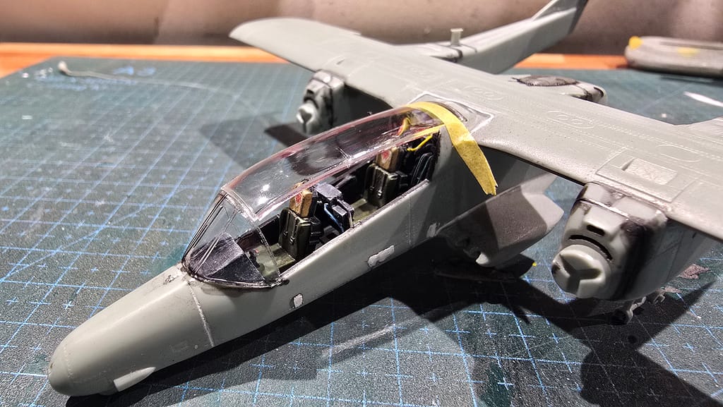 Cuando tuve todo presentado dentro del fuselaje, decidí separar la canopia en secciones, como en el Bronco real. Marqué las líneas y la corté con un minicerrucho. Después lijé y pulí los bordes para recuperar la transparencia .