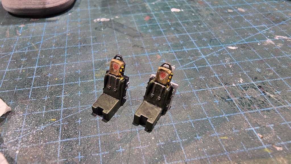 Para la cabina arranqué pintando las piezas principales, aplicando sombras y algunos detalles rápidos en los paneles y los asientos. También realice en scrach las palancas del asiento eyector.