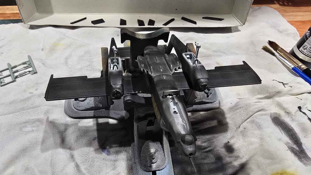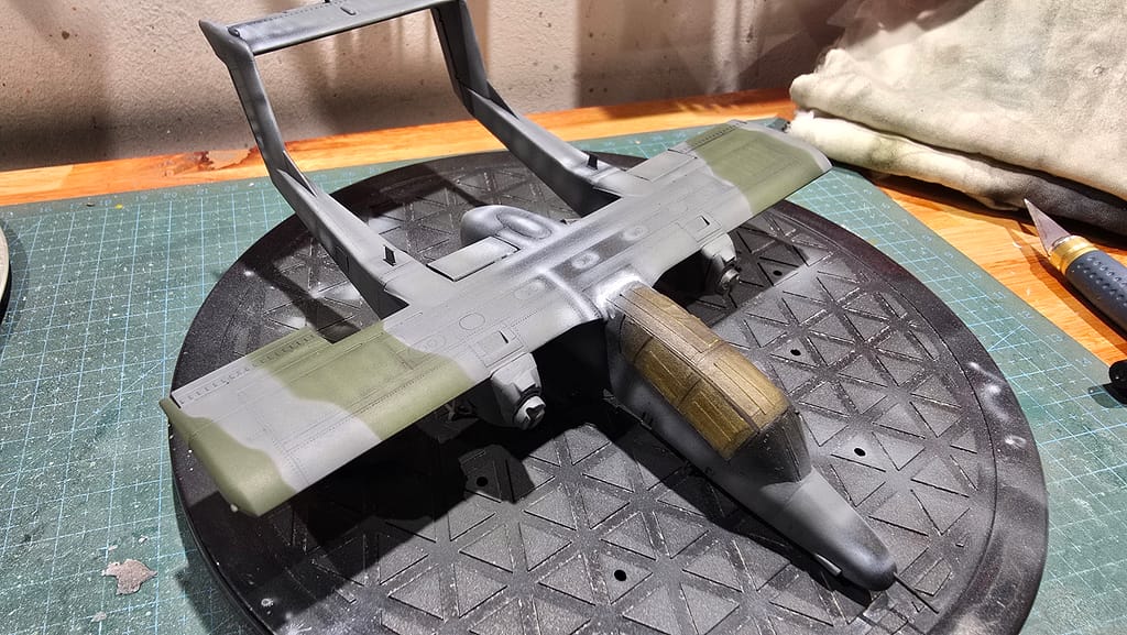 Con la imprimación ya seca, empecé a marcar los paneles y las zonas de sombra. Fui trabajando con pasadas suaves, aprovechando el negro como base para generar profundidad. En las alas y en el fuselaje central marqué líneas y paneles para que después, al aplicar los colores finales, se mantuviera ese efecto de volumen que tanto ayuda a que el modelo no quede plano.
