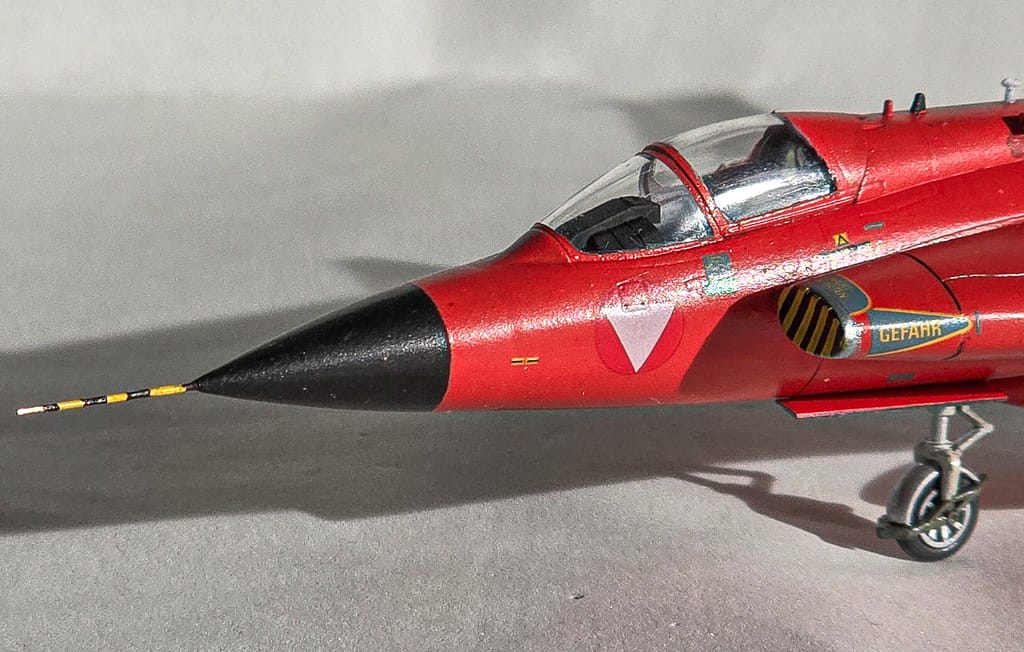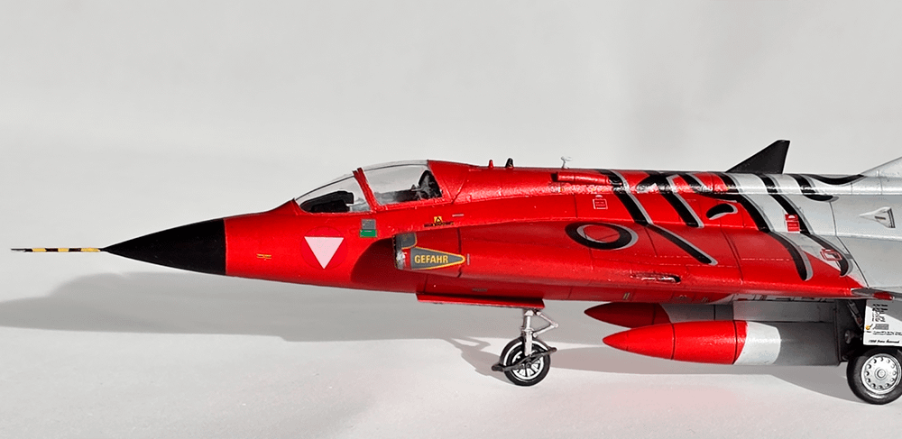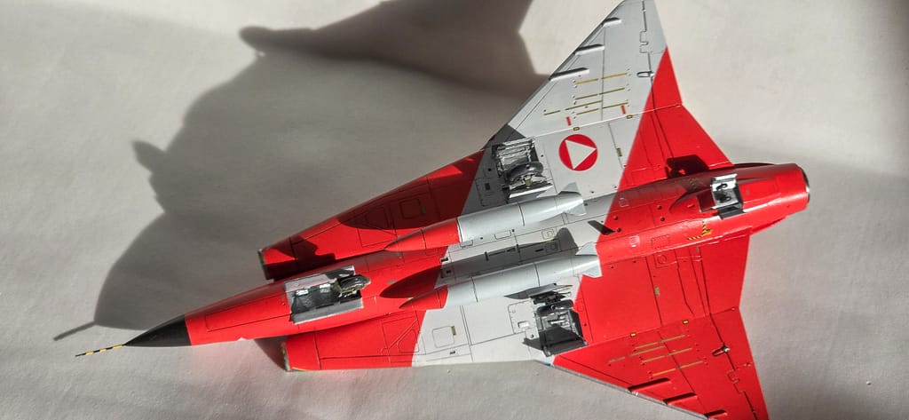 El esquema que elegí es el de la Fuerza Aérea Austriaca (1996), con sus dos colores principales: blanco y rojo. Primero apliqué una imprimación gris, dejé secar bien y después pinté todo el modelo de blanco. Recién ahí pasé al rojo, cuidando mucho los límites entre ambos tonos.