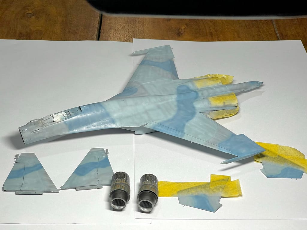 Utilicé acrílicas de AMMO Mig, aplicando una base de primer blanco y luego capas muy finas para generar variaciones sutiles y desgaste integrado desde la pintura. Trabajé el camuflaje celeste típico del SU-35 con transiciones suaves, jugando con tonos intermedios para evitar que el esquema quede plano.