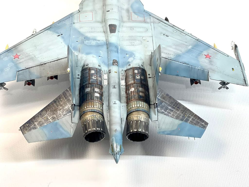 Siempre me atrajo este avión por su diseño imponente, las curvas y volúmenes tan característicos de la familia Flanker y esa estética bélica que distingue a los cazas rusos. En 1/72 encuentro un punto exacto entre detalle, espacio y manejabilidad que me permite concentrarme en las técnicas de pintura que más disfruto.