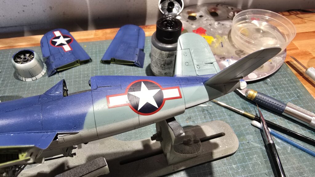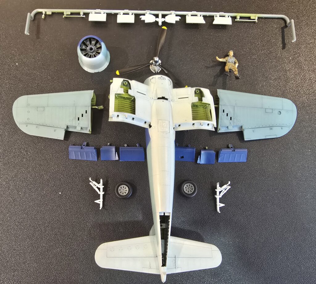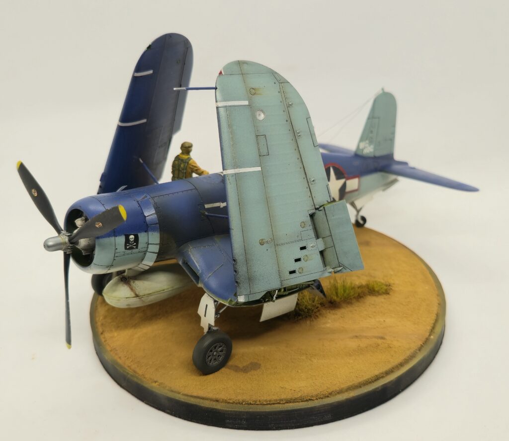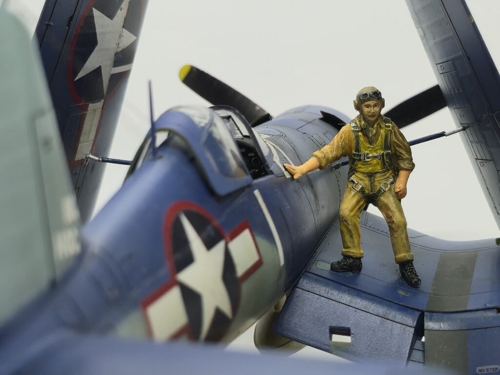Desde el inicio, el objetivo fue capturar la esencia del “Big Hog” con fidelidad histórica y una ambientación que evocara las Islas Salomón. Las alas plegadas, típicas de los cazas embarcados, demandaron ajustes para lograr una posición natural y convincente. La cabina fue enriquecida con cristal liquido para simular los instrumentales, mientras que la figura del piloto, posada sobre el ala, aporta narrativa y contexto.