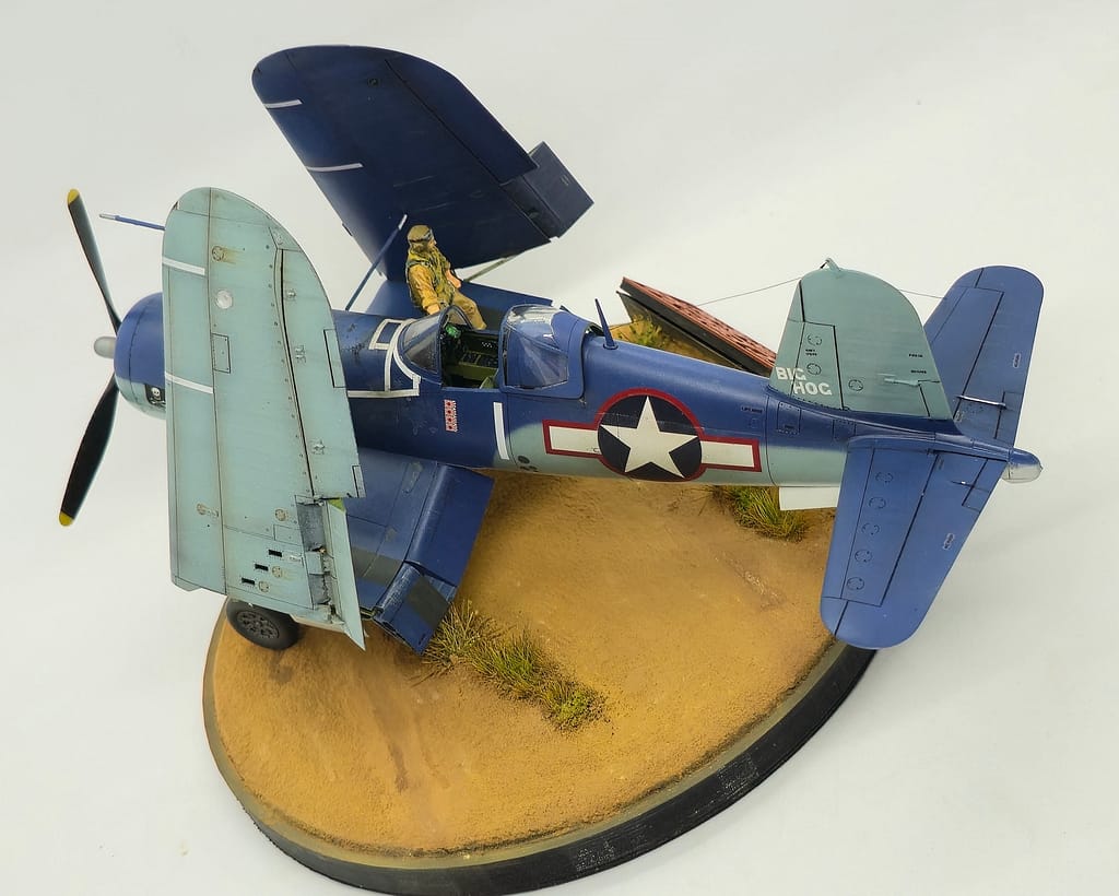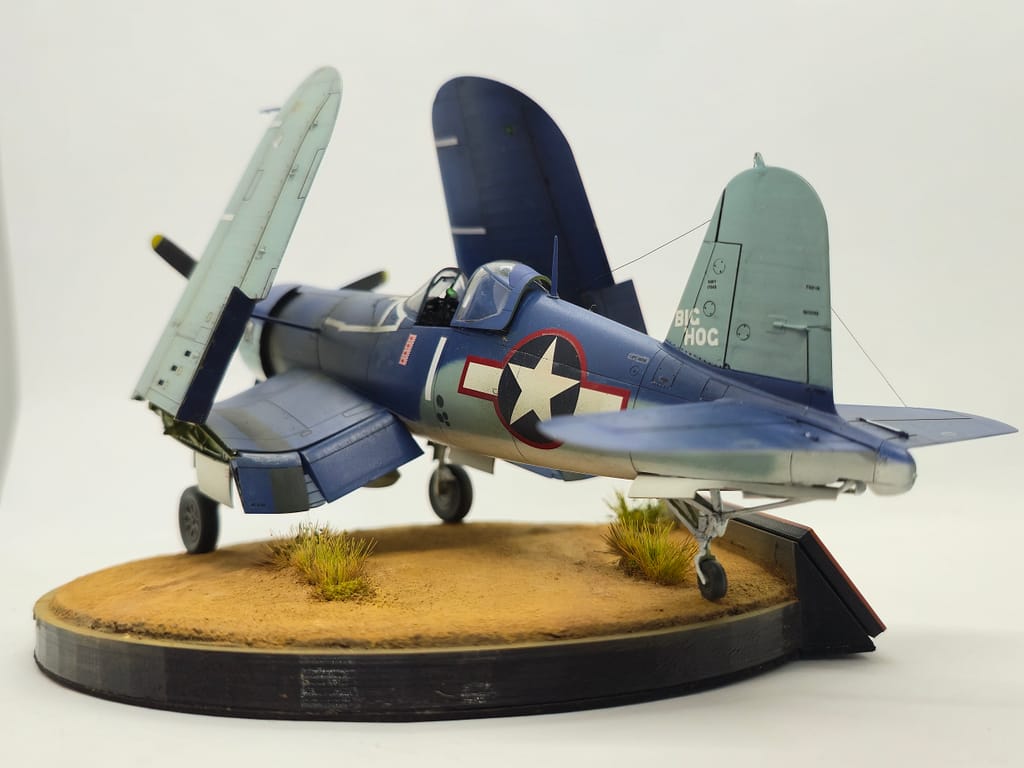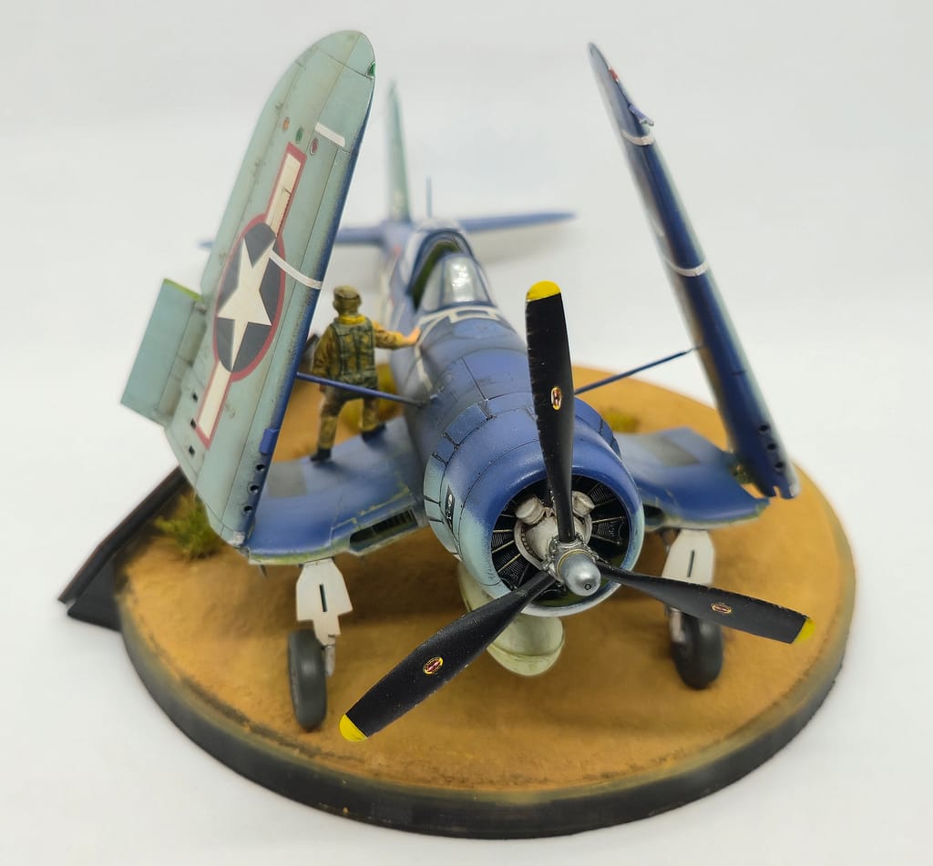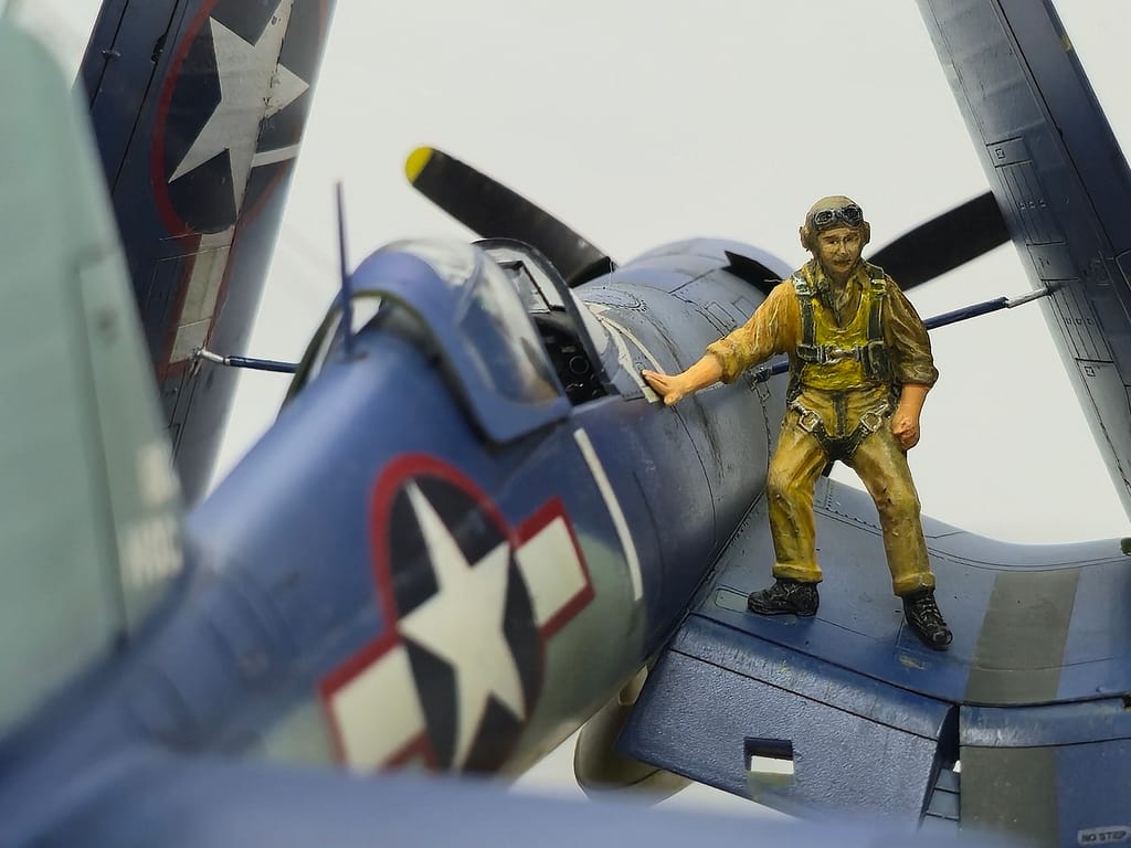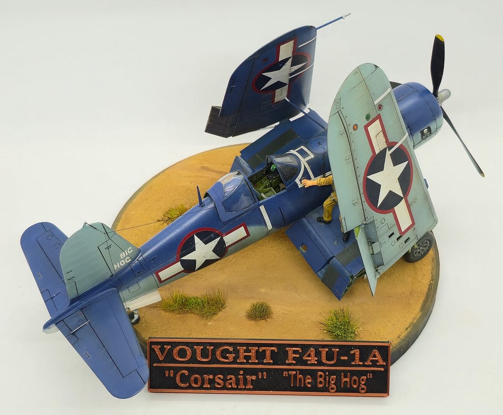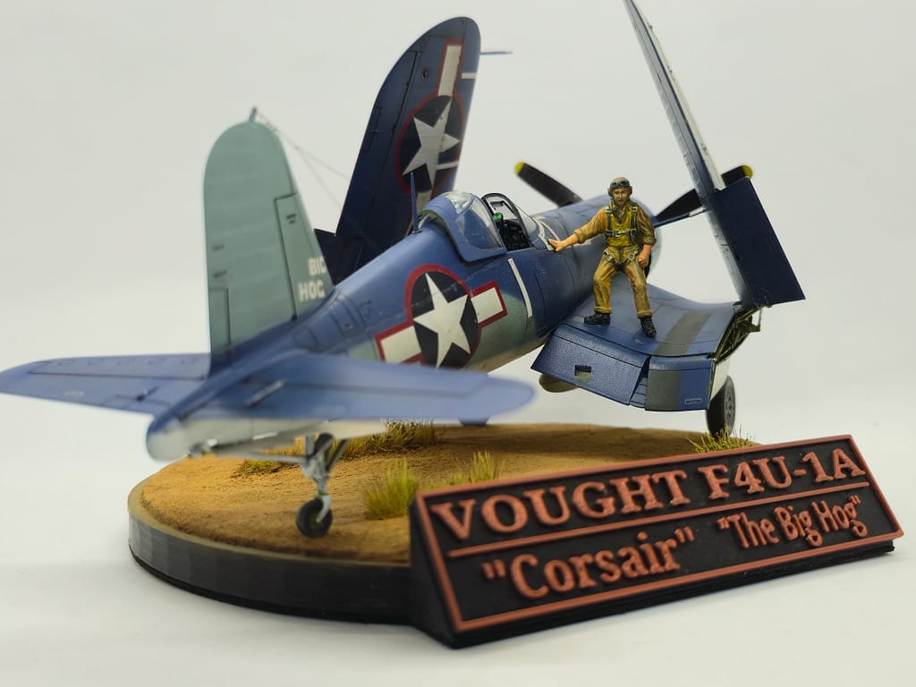 Desde el inicio, el objetivo fue capturar la esencia del “Big Hog” con fidelidad histórica y una ambientación que evocara las Islas Salomón. Las alas plegadas, típicas de los cazas embarcados, demandaron ajustes para lograr una posición natural y convincente. La cabina fue enriquecida con cristal liquido para simular los instrumentales, mientras que la figura del piloto, posada sobre el ala, aporta narrativa y contexto.