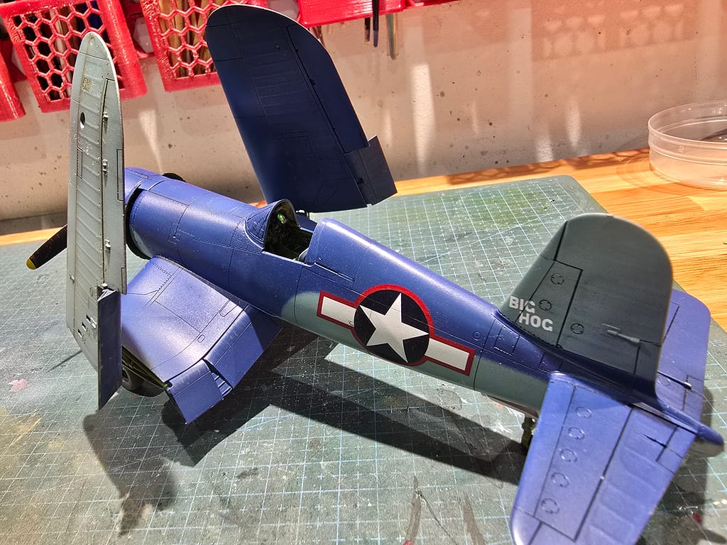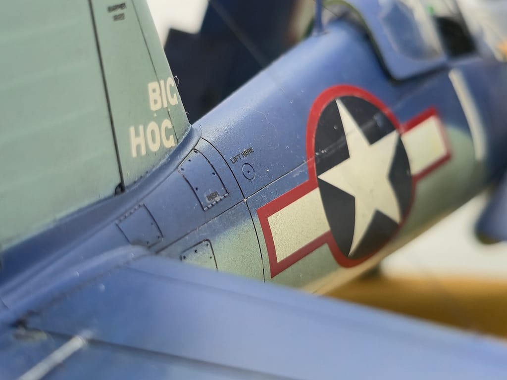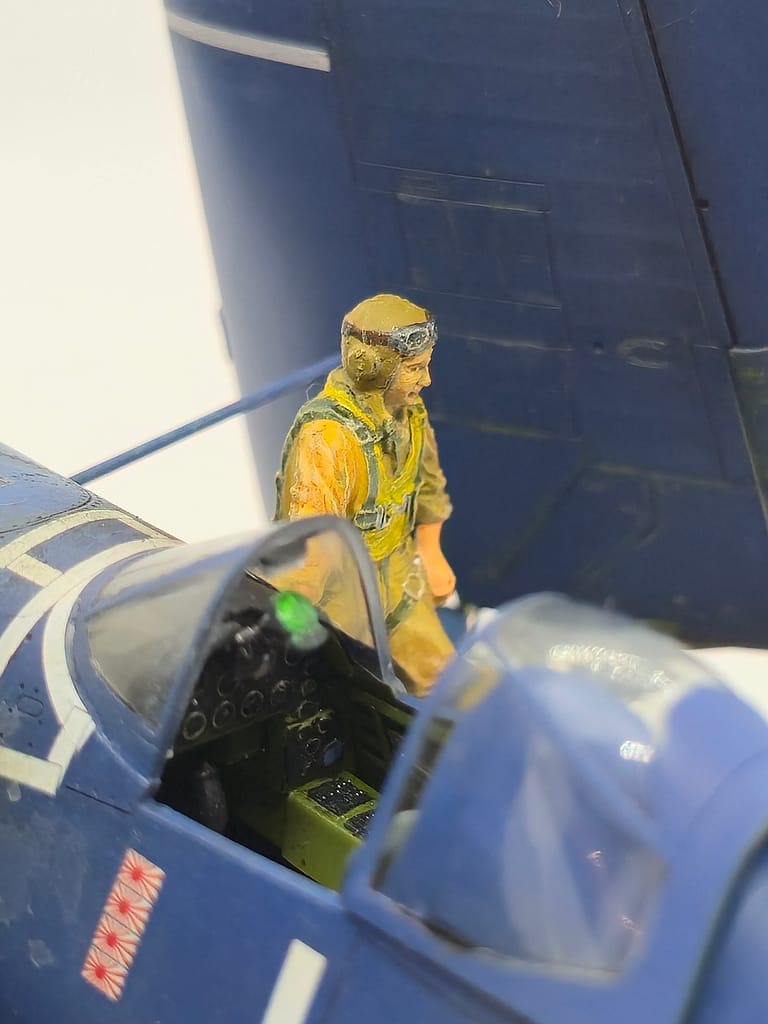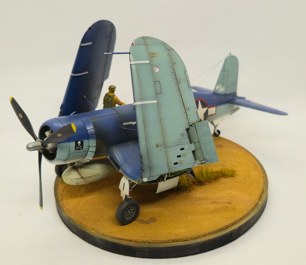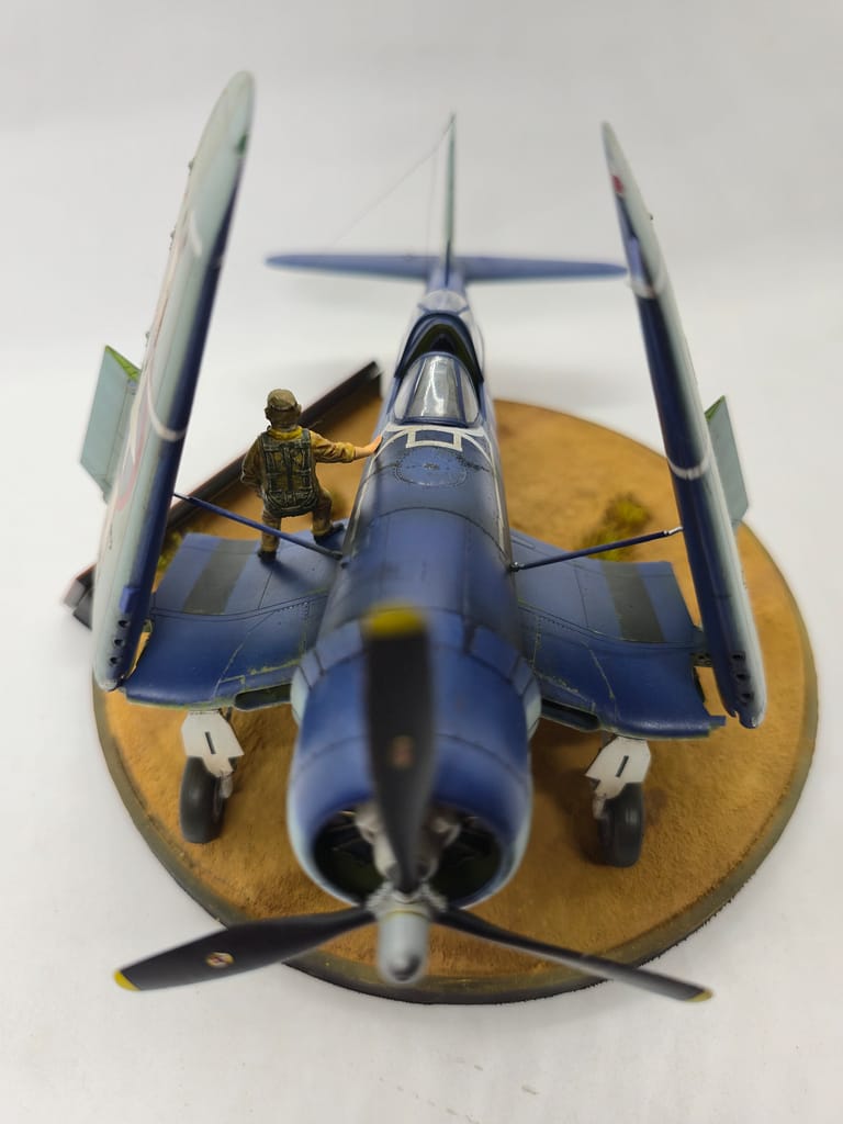 Desde el inicio, el objetivo fue capturar la esencia del “Big Hog” con fidelidad histórica y una ambientación que evocara las Islas Salomón. Las alas plegadas, típicas de los cazas embarcados, demandaron ajustes para lograr una posición natural y convincente. La cabina fue enriquecida con cristal liquido para simular los instrumentales, mientras que la figura del piloto, posada sobre el ala, aporta narrativa y contexto.