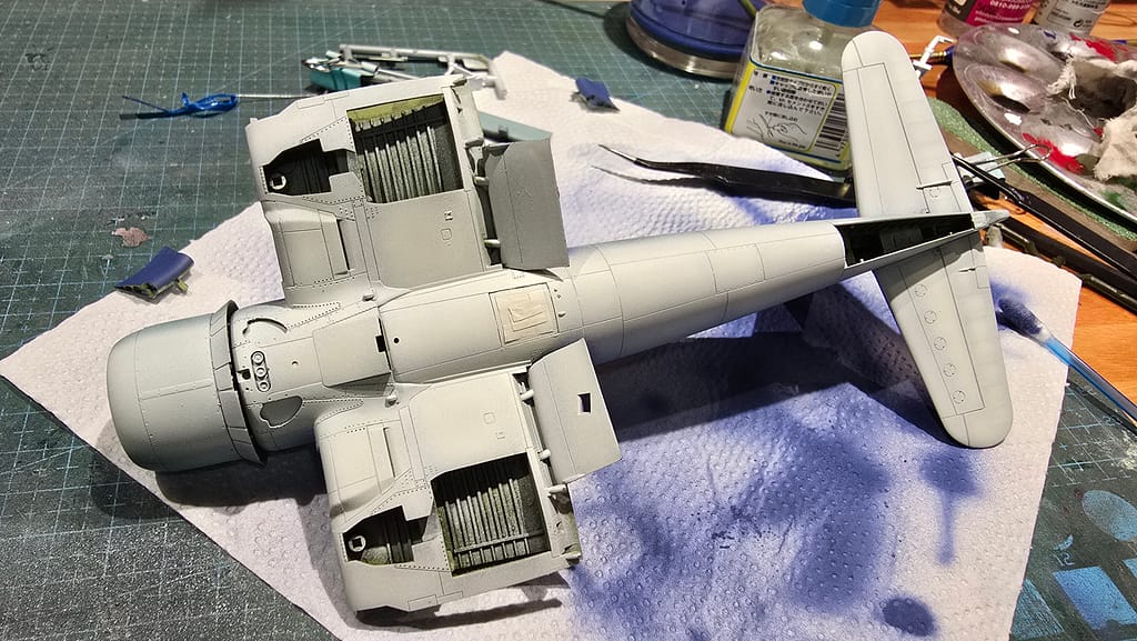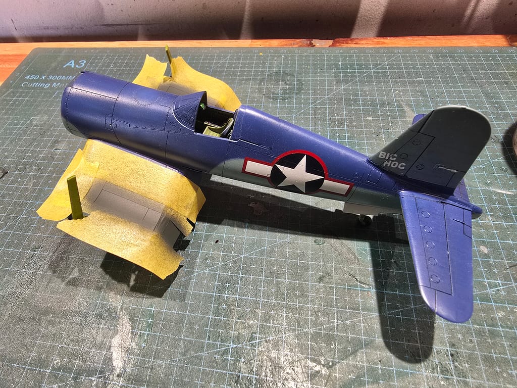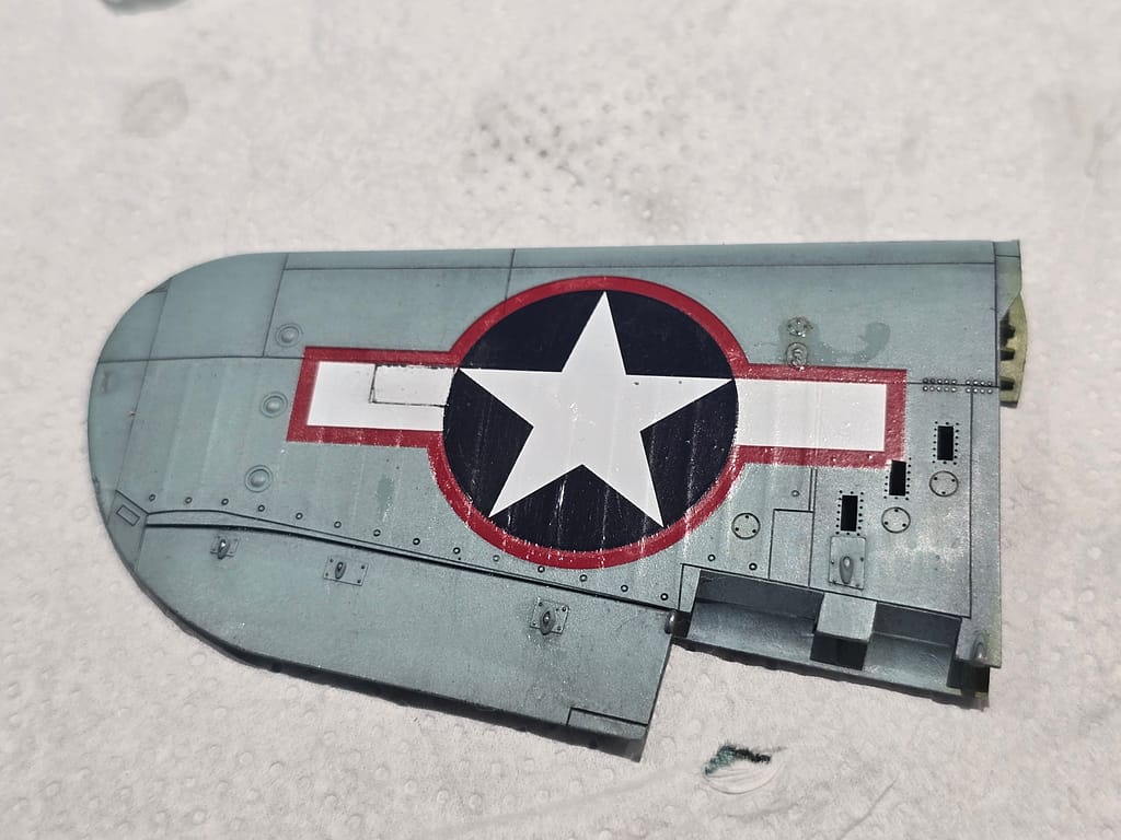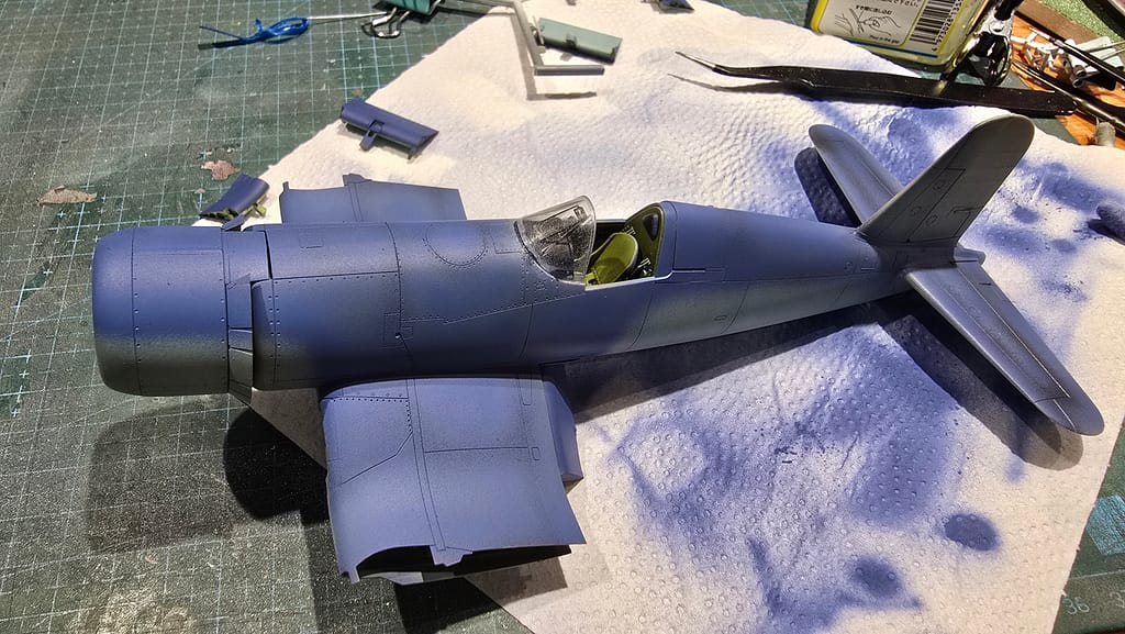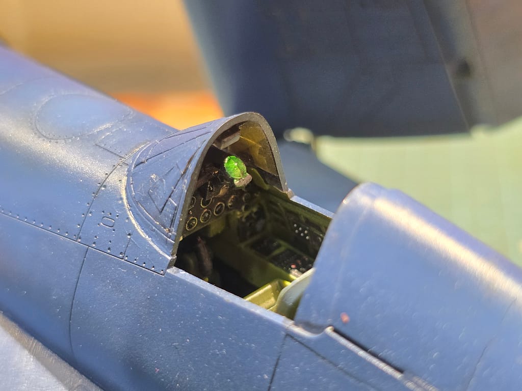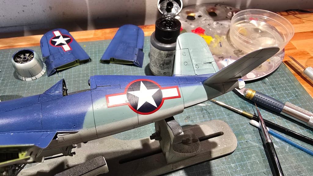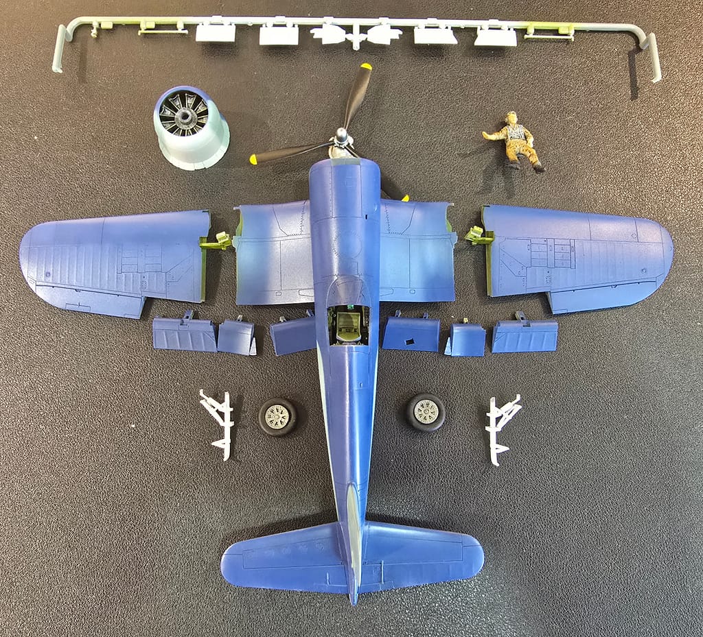 Desde el inicio, el objetivo fue capturar la esencia del “Big Hog” con fidelidad histórica y una ambientación que evocara las Islas Salomón. Las alas plegadas, típicas de los cazas embarcados, demandaron ajustes para lograr una posición natural y convincente. La cabina fue enriquecida con cristal liquido para simular los instrumentales, mientras que la figura del piloto, posada sobre el ala, aporta narrativa y contexto.